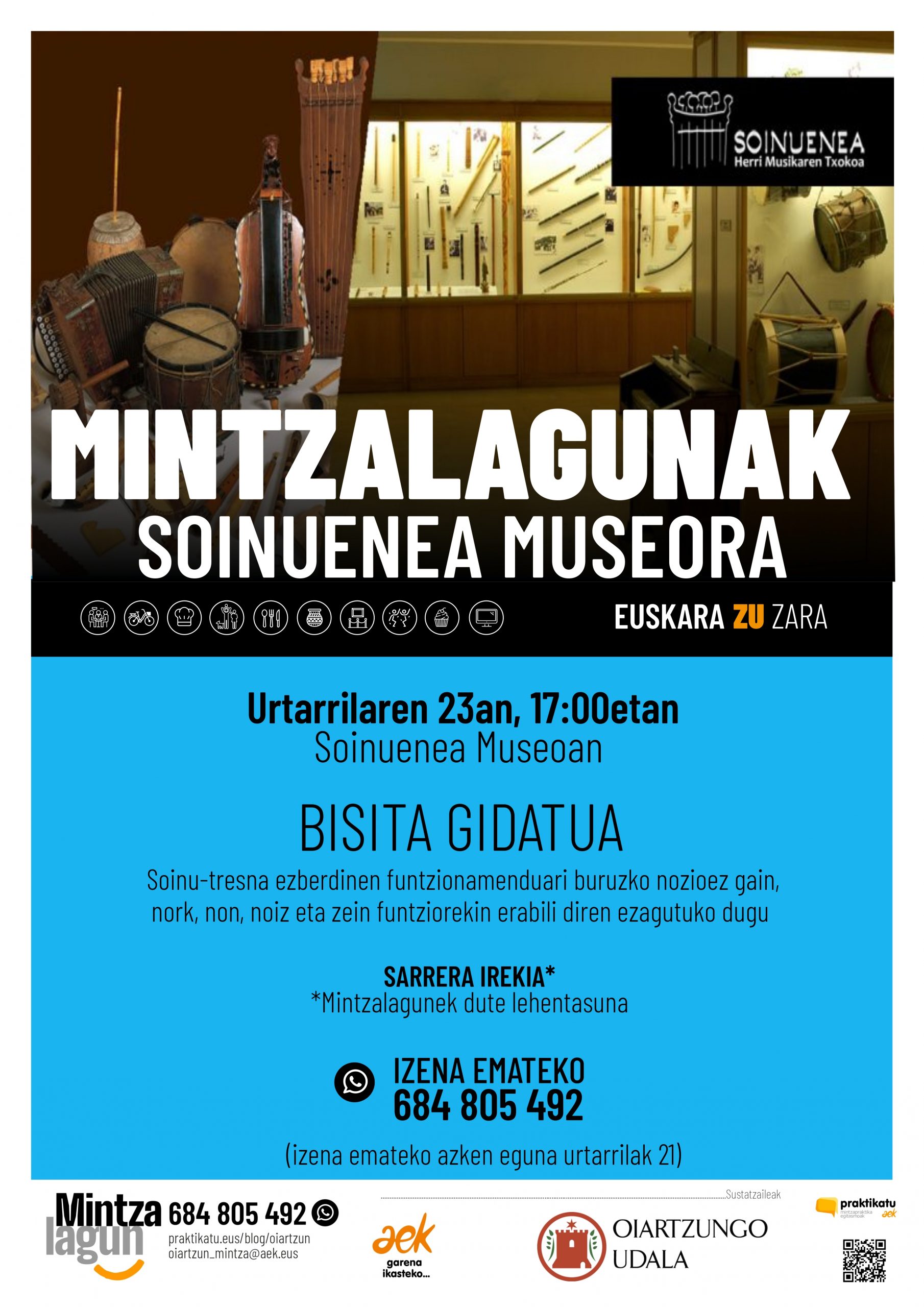 Datorren ostiralean, urtarrilak 23, Soinuenea Museora bisita egingo dugu. Bertan, soinu-tresna ezberdinen funtzionamenduaz gain, haien erabilera eta funtzioa ezagutuko ditugu. Hitzordua 17:00etan izango da, Museoan…