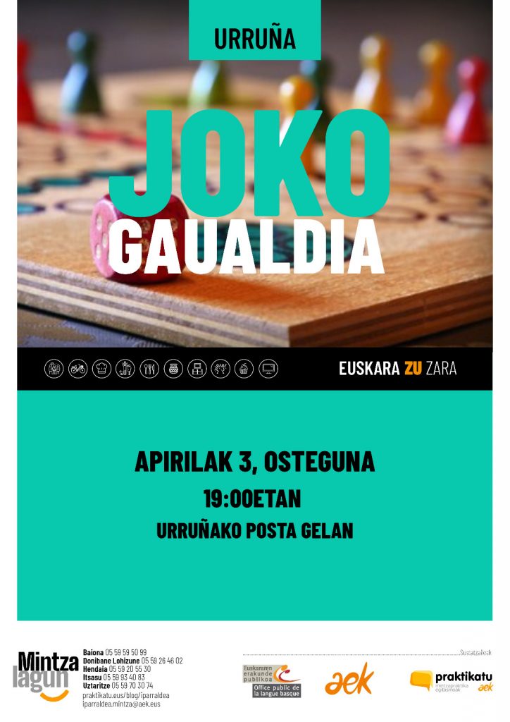 Donibane Lohizune eta Hendaiako eskualdeko Mintzalagunok hitzordua dugu, joko gaualdi baten inguruan, Urruñako Posta gelan, apirilaren 3an, 19:00etan.