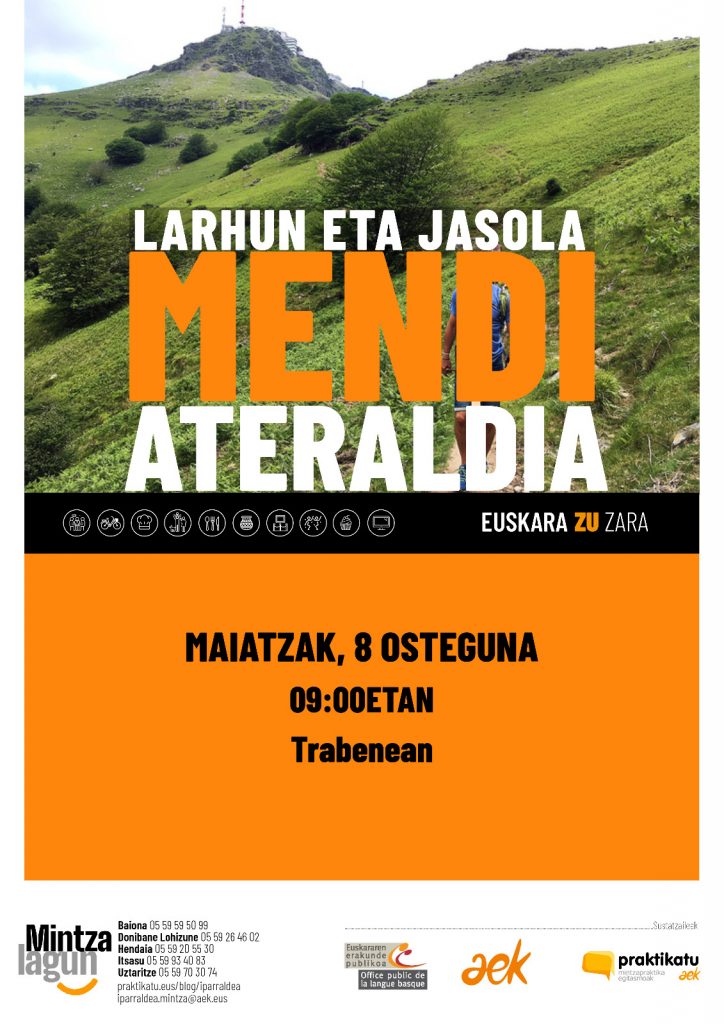 Maiatzaren 8an, ostegunarekin, mendi ateraldia eginen dugu Hego Lapurdiko Mintzalagun taldeetako kideok. Goizeko 09:00etan Trabeneko aparkalekutik abiatuko gara, eta, Jasolatik goiti, Larhun inguruan eginen dugu ibilaldia. Ondoren, Jasolako bentan zerbait janen dugu denok elkarrekin.