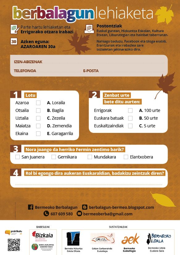 Lehiaketan parte hartzeko bete ditzakezue Kulturetxean, liburutegian, tabernetan, euskal gunean, Hizkuntza Eskolan, eta berbalagun taldeetan egongo diren eskuorriak.