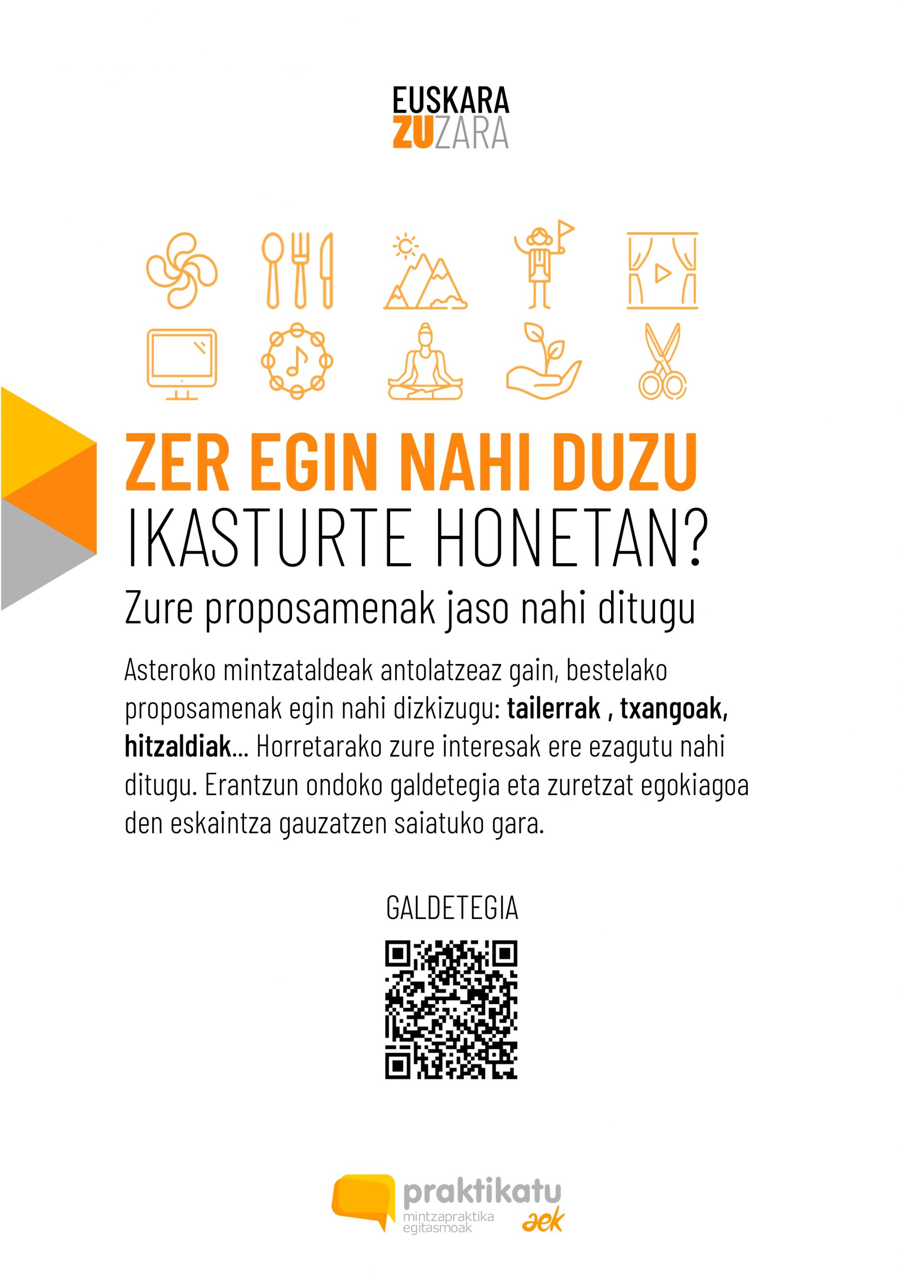 Proposatu aurten zer nahi duzun egin eta gure kontura antolatzea. Horrez gain, antolatzen, ematen, gidatzen, lagundu nahi baduzu, primeran! Euskara zu zara!