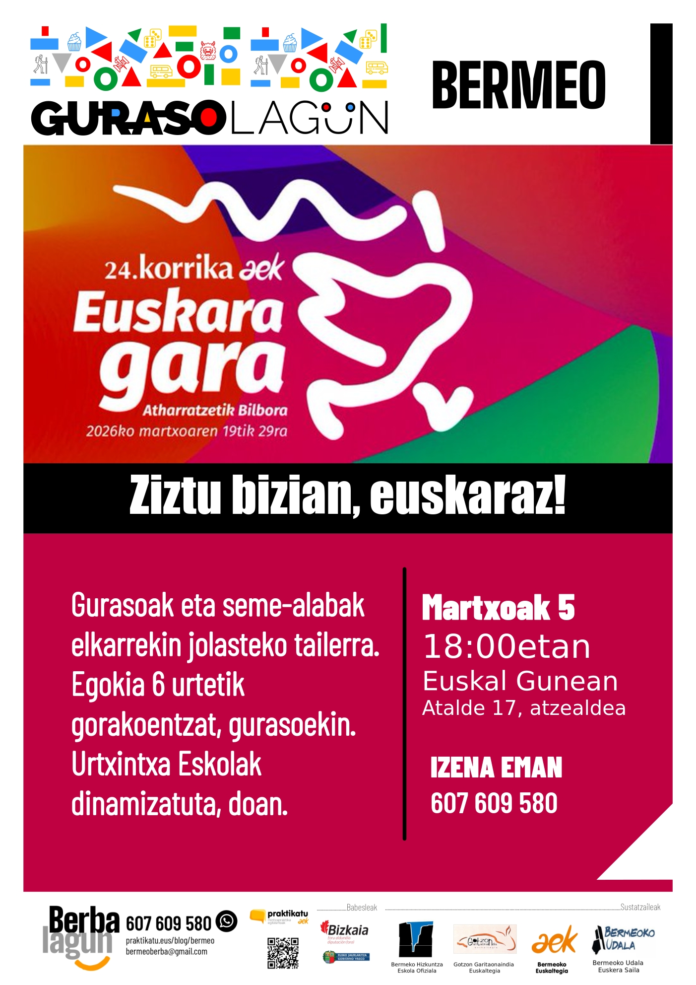 Martxoaren 5ean, ostegunean, gurasoak eta seme-alabak elkarrekin jolasteko tailerra izango dugu Euskal Gunean, 18:00etatik 19:00etara. Eguraldi ona bada, kanpoaldean egongo gara, eta euria bada, Bermeoko…