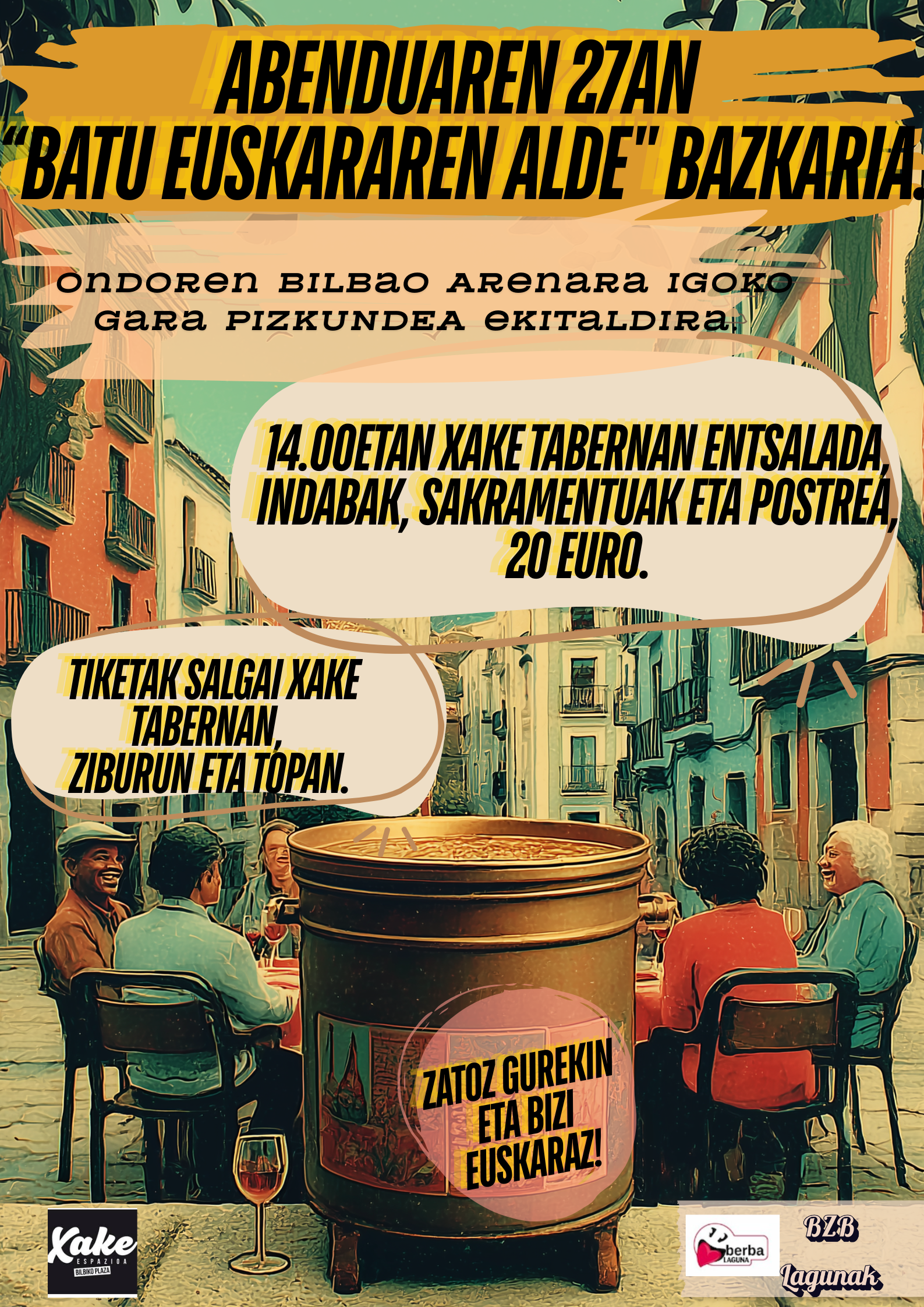 Abenduaren 27an “batu euskararen alde” bazkaria. Ondoren Bilbao Arenara igoko gara PIZKUNDEA ekitaldira. 14.00etan Xake Tabernan entsalada, indabak, sakramentuak eta postrea, 20 euro. Tiketak salgai…