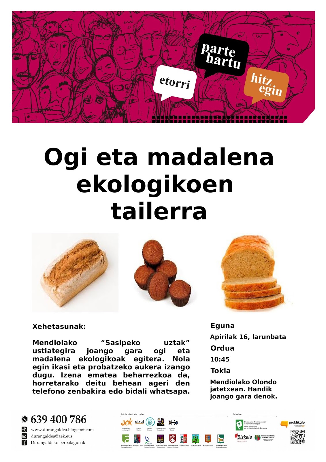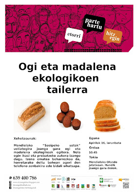 Eta larunbatean, apirilak 16, Mendiolara joango gara ogi eta madalena ekologikoak egiten ikastera. Animatzen zara? zatoz, goiz eder eta gozo bat igaroko dogu eta!!!