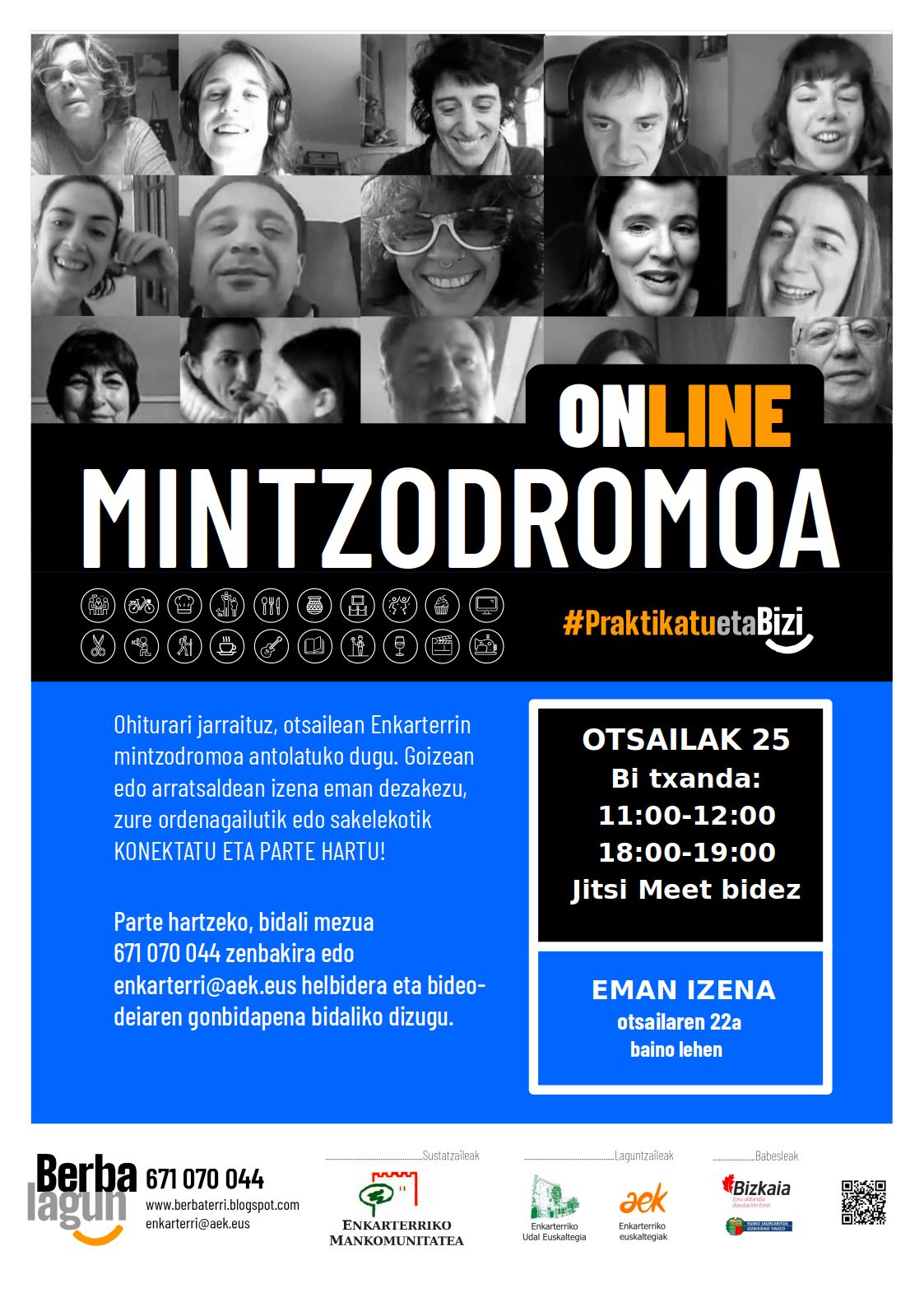 Enkarterriko Berbalagunon jarduerak ez du etenik! Hori dela eta, azken urteotako ohiturari jarraituz, otsailaren 25ean mintzodromoa online antolatuko dugu. Bi saio izango ditugu, bata goizean (11:00etan), eta bestea arratsaldean (18:00etan); zuek batean ala bestean (edo bietan) parte hartu ahal duzue. Parte hartzea oso erreza eta erosoa izango da, zuen etxetik arituko zarete, bai ordenagailuz, bai eskuko telefono bidez.