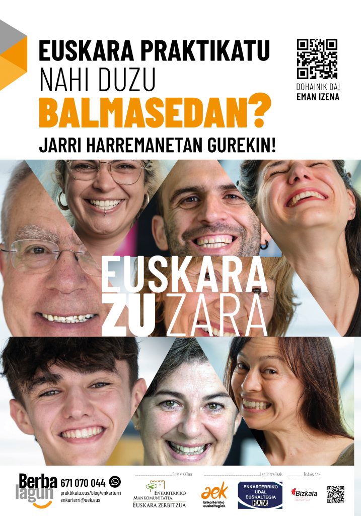 -Berbalagun dinamizatzaileak: “Izena emateko prozedura erraza da: klikatu lotura honetan http://emanizena.praktikatu.eus/” eta bete formularioa. Bestela, nahiago baduzu, beste hainbat aukera dituzu: bidali whatsappa (671 070 044), e-posta (enkarterri@aek.eus) edo galdetu zure herriko euskaltegian”.