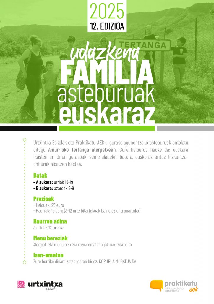 Urtxintxa Eskolak eta Praktikatu-AEKk gurasolagunentzako asteburuak antolatu ditugu Amurrioko Tertanga aterpetxean. Gure helburua hauxe da: euskara ikasten ari diren gurasoak, seme-alabekin batera, euskaraz arituz hizkuntza-ohiturak aldatzen hastea.