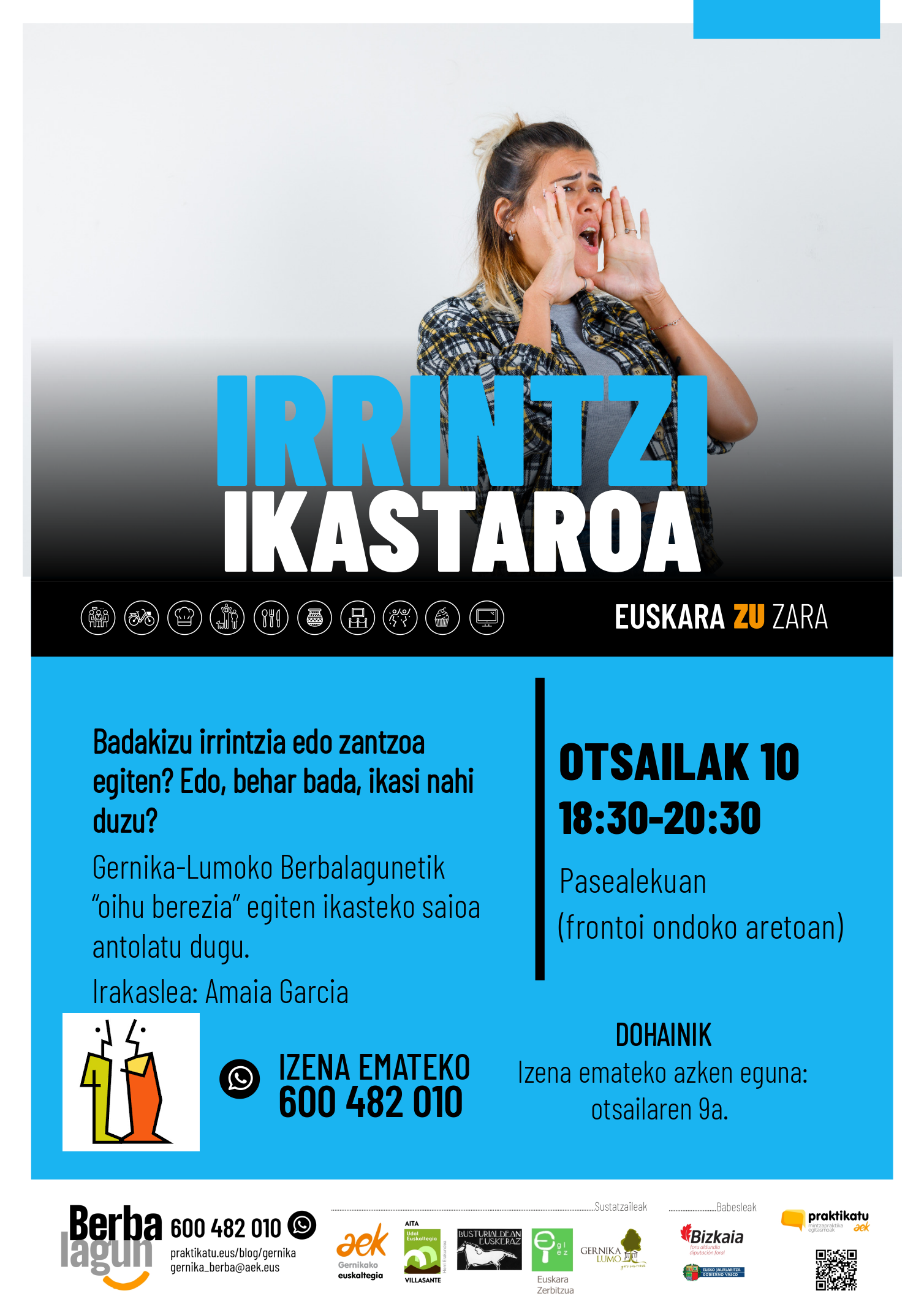 Gernika-Lumoko Berbalagunek irrintzi-ikastaroa antolatu du otsailaren 10erako. Pasealekuko frontoiaren ondoko aretoan elkartuko gara, arratsaldeko 18:30etik 20:30era. Amaia Garciak emango dizkigu zenbait aholku irrintzia egiten ikasteko…