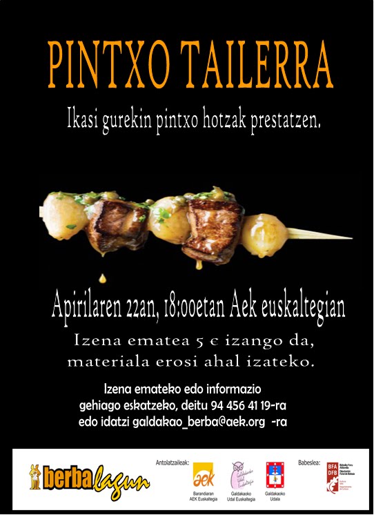 Bihar, apirilaren 22an, osteguna, pintxo hotzak egiten ikasteko aukera izango dugu.Arratsaldeko 18:30ean elkartuko gara AEK euskaltegian. Iñaki gure sukaldari maiteak bost pintxo hotz ezberdin zelan egin irakatsiko digu bihoarkoan. Gainera gure zalantza eta kexka guztiak bertan argitu ahal izango ditugu: elikagai hauxe zeinekin doa ondo, beste hauxe beste zeinekin nahastu ahal dut…