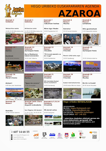 AZAROKO AGENDA 2013-10-31 Bidalketetan zehar nabigatu Previous Previous post: LIBRE GALDAKAOREN EGITARAUANext Next post: ASTE HONETAN ETA HURRENGOAN HITZALDI INTERESGARRIAK