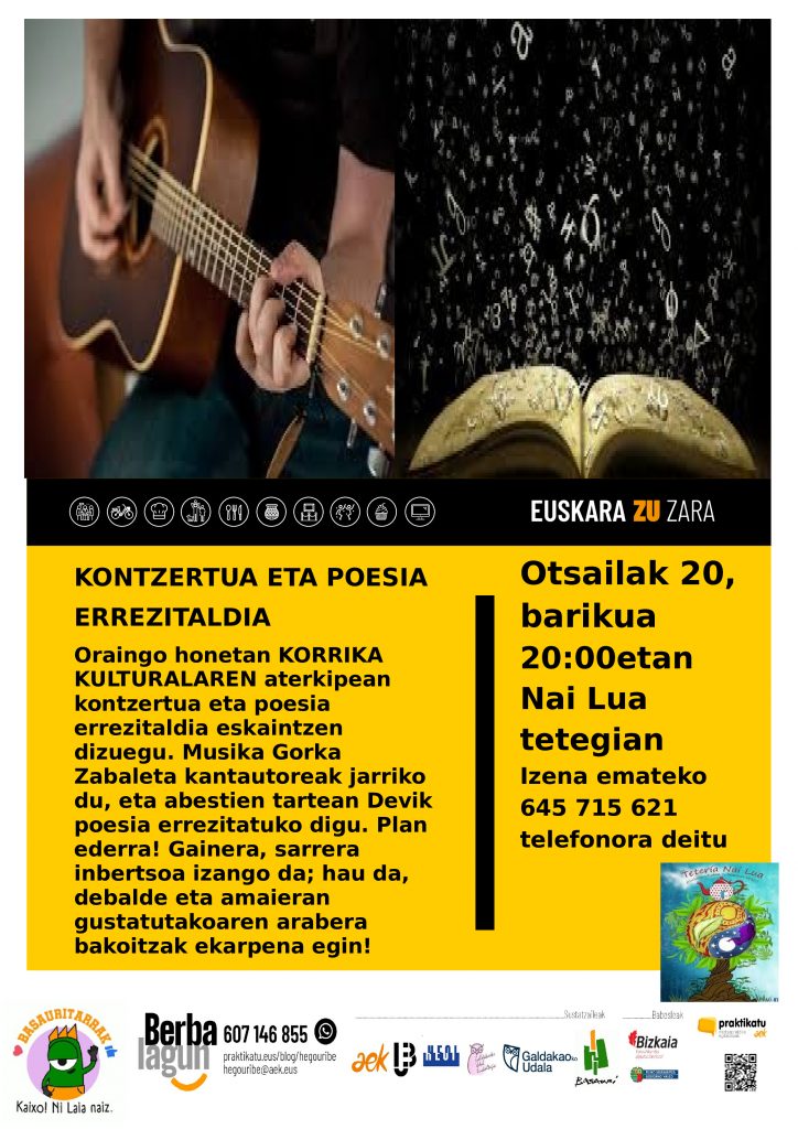 Oraingo honetan KORRIKA KULTURALAREN aterkipean kontzertua eta poesia errezitaldia eskaintzen dizuegu. Musika Gorka Zabaleta kantautoreak jarriko du, eta abestien tartean Devik poesia errezitatuko digu. Plan ederra! Gainera, sarrera inbertsoa izango da; hau da, debalde eta amaieran gustatutakoaren arabera bakoitzak nahi/ahal duen ekarpena egingo du! “Free-tour” baten antzekoa, baina euskal musika eta poesiaz gozatzeko aukera izanda! Ez egin zalantzarik eta anima zaitez!