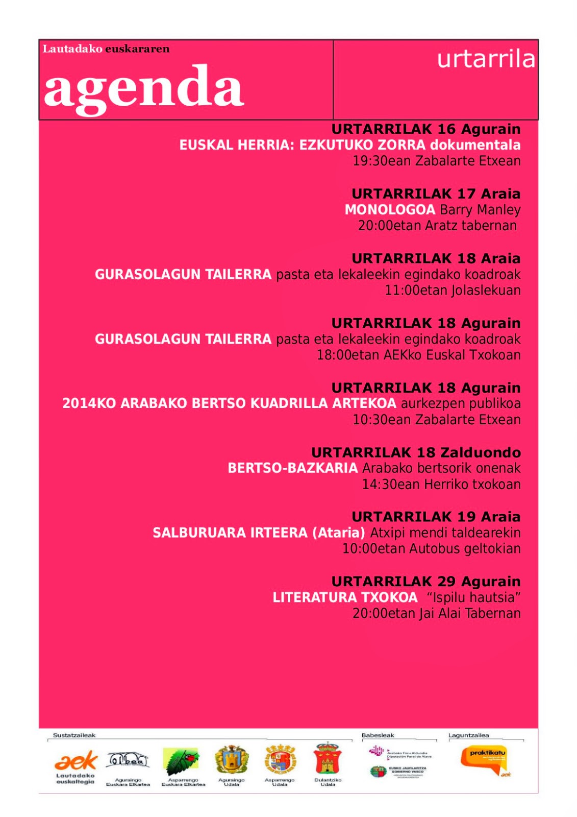 urtarrileko agenda 2014-01-08 Bidalketetan zehar nabigatu Previous Previous post: EMAKUMEEN AHALDUNTZEA; ALDAKETARAKO GILTZANext Next post: DOKUMENTALA Euskal Herria: Ezkutuko zorra
