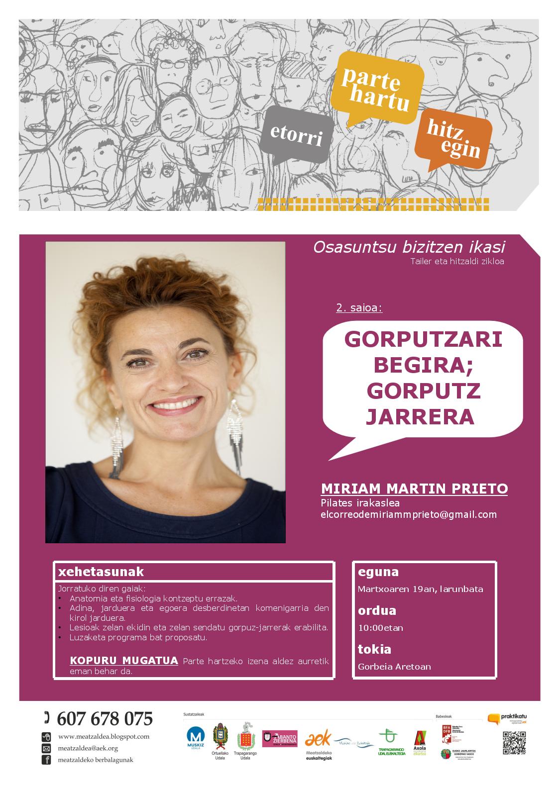 Martxoaren 19an, OSASUNTSU BIZITZEN IKASI zikloaren 2.saioa egingo dugu, Ortuellako Gorbeia Aretoan. Bigarren saio honetan Marian Martin Prieto pilates irakaslea izango dugu gurekin. Saioan jorratuko diren gaiak hurrengoak dira: