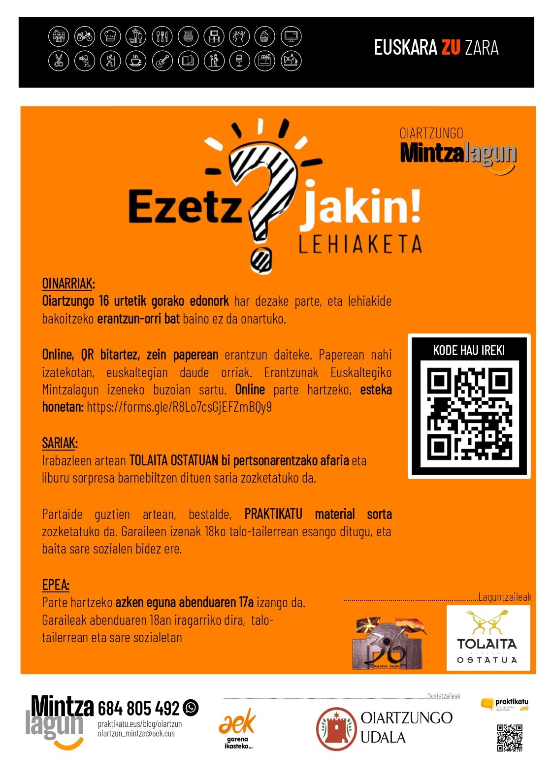 Zenbat dakizu herriari eta euskarari buruz? 15 galderak erantzunez gero, sari ederrak irabaz ditzakezu! 🔸 Tolaita ostatuan 2 pertsonarentzat afaria eta liburu sorpresa. 🔸PRAKTIKATUko material…