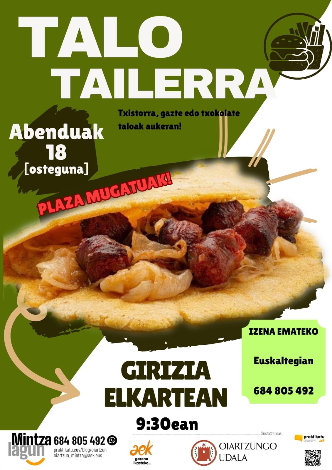 Urtea ongi amaitzeko, talo-tailerra egingo dugu datorren ostegunean, hilak 18, euskaltegiko ikasleekin batera. Taloak egiten ikasi, euskaraz aritu, jende berria ezagutu eta urte berria elkarrekin…