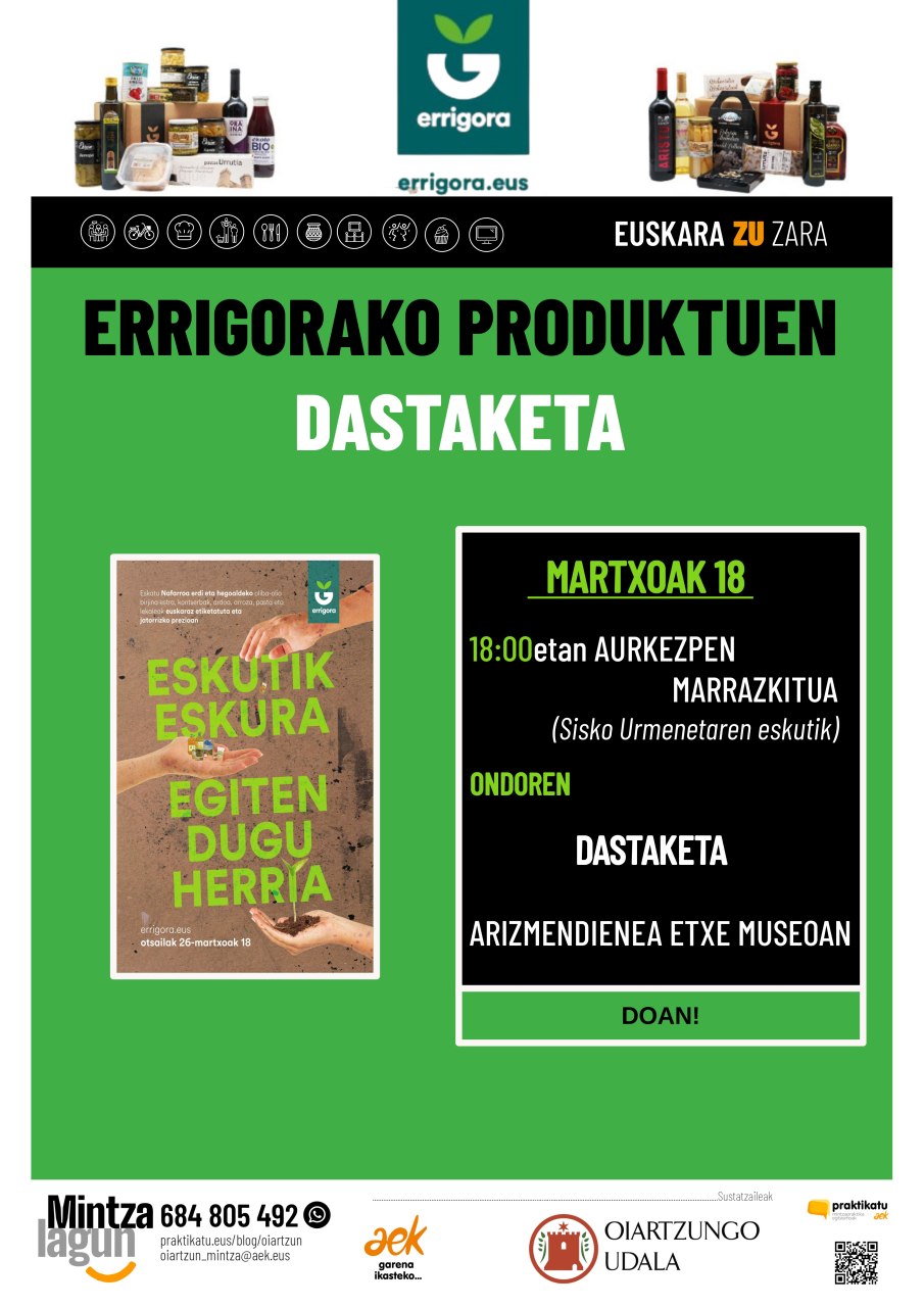 ERRIGORAKO PRODUKTUEN DASTAKETA! Martxoaren 18an, Arizmendienea etxe museoan, errigorako “eskutik eskura” kanpainaren aurkezpen marrazkitua egingo dugu, Asisko Urmeneta marrazkigilearen eskutik. Ondoren, errigorak eskaintzen dituen produktuak…