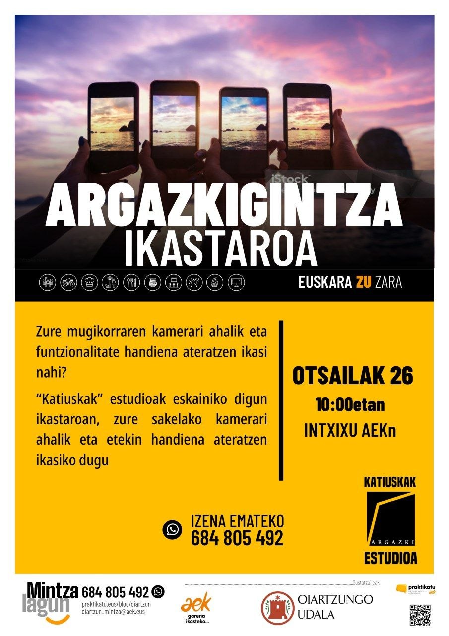 Katiuskak estudioaren eskutik, mugikor bidezko argazkigintza ikastaroa izango dugu ostegunean. Hortaz, zure mugikorrarekin argazkiak egiten trebatu nahi baduzu, eman izena! 10:00etan izango da hitzordua, Intxixu…