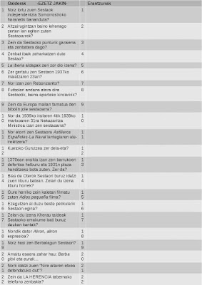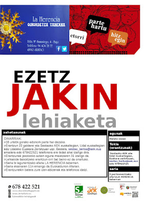 Saria: Galdera guztiak ondo erantzun dituztenen artean zozketa egingo da ekainaren 11n Sestaoko Euskaldunon Afarian. Saria 2 lagunentzako afaria La Herencia tabernan.