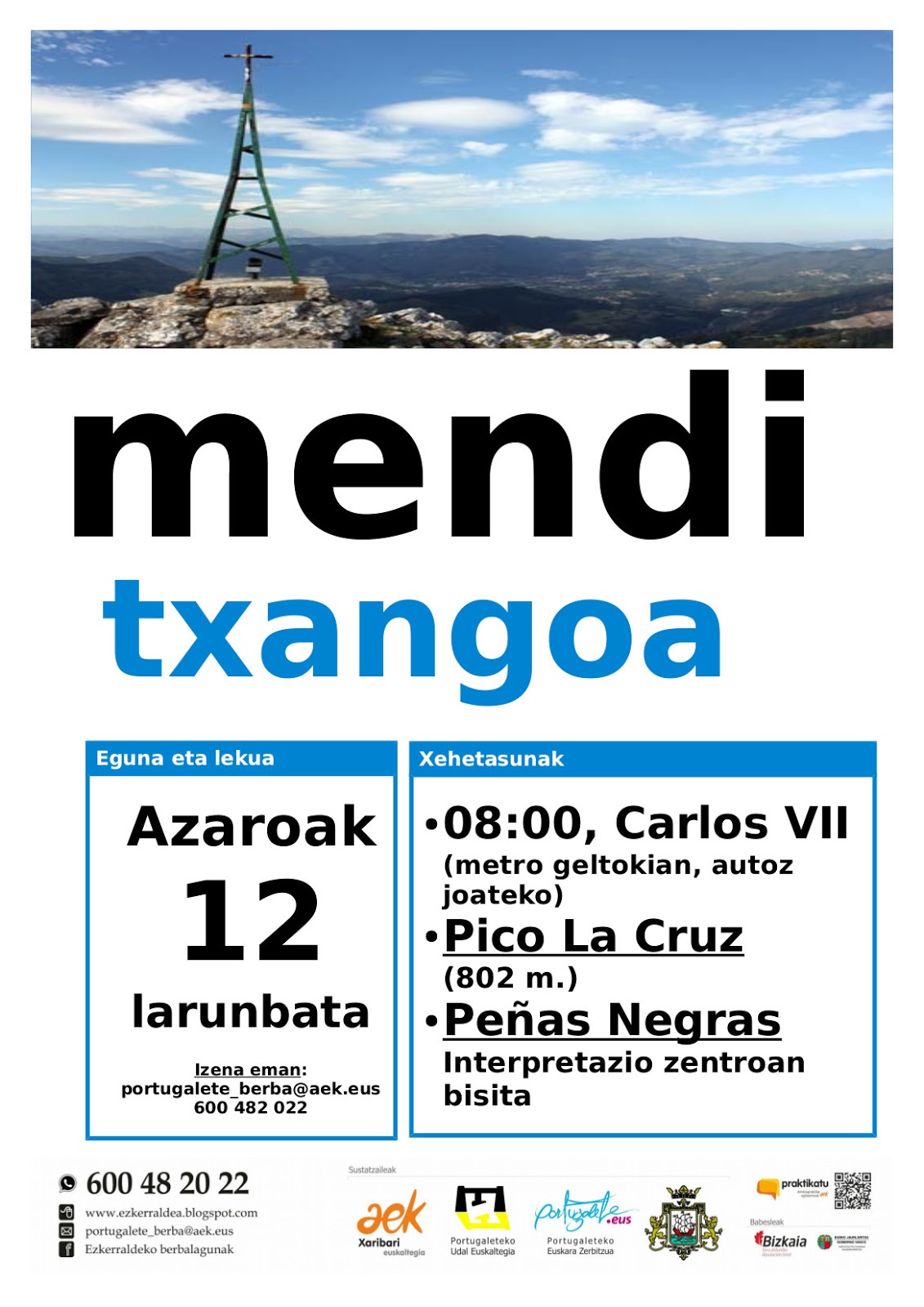Datorren larunbatean, azaroak 12, mendi txango polita egingo dugu Portugaleteko berbalagunok: Zugaztietako (La Arboleda) Gurutzegane (Pico la Cruz) mendia, eta horren ondoren Arribeltzaga (Peñas Negras) interpretazio zentroan bisitaldia.