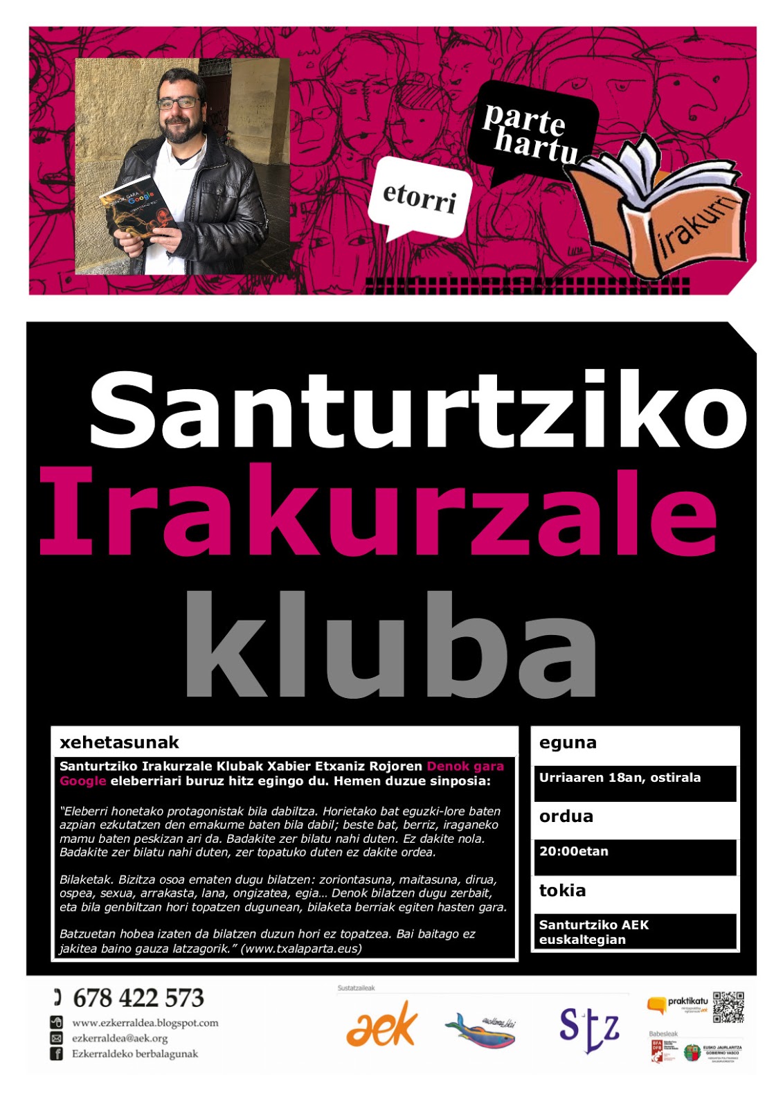 Santurtziko Irakurzale Klubean, hirugarrenez izan dugu Xabier Etxaniz Rojo idazlea, eta, beti bezala, plazera izan da. Oraingoan, “Denok gara Google”-i buruz (azken eleberria) solastera etorri zitzaigun.