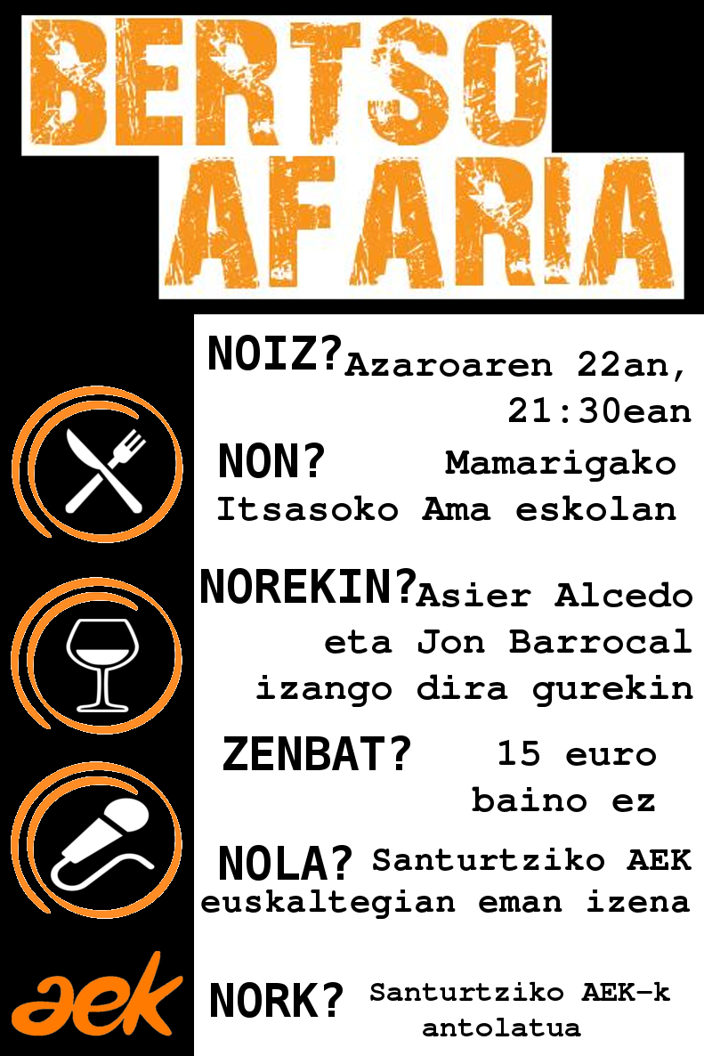 Eta horren ostean, gehiago izango dugu: bertso-afaria antolatu du AEK-k Mamarigako Itsasoko Ama eskolan Asier Alcedo eta Jon Barrocal bertsolariekin. Izena eman nahi baduzu, pasatu AEK euskaltegitik. 15 euroren truke, ez galdu aukera (menu beganoa ere izango da)!