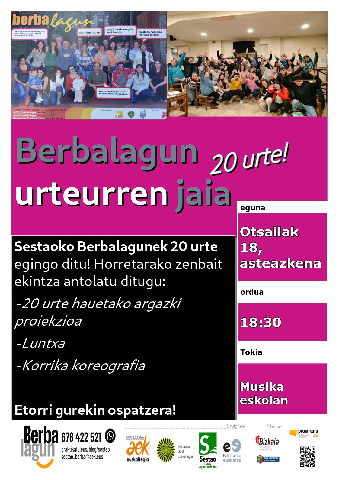 Sestaoko Berbalagunek 20 urte egingo ditu! Horretarako zenbait ekintza antolatu ditugu:20 urte hauetako argazki proiekzioa, luntxa, Korrika koreografia… Etorri gurekin ospatzera! -Eguna: otsailak 18, asteazkena…