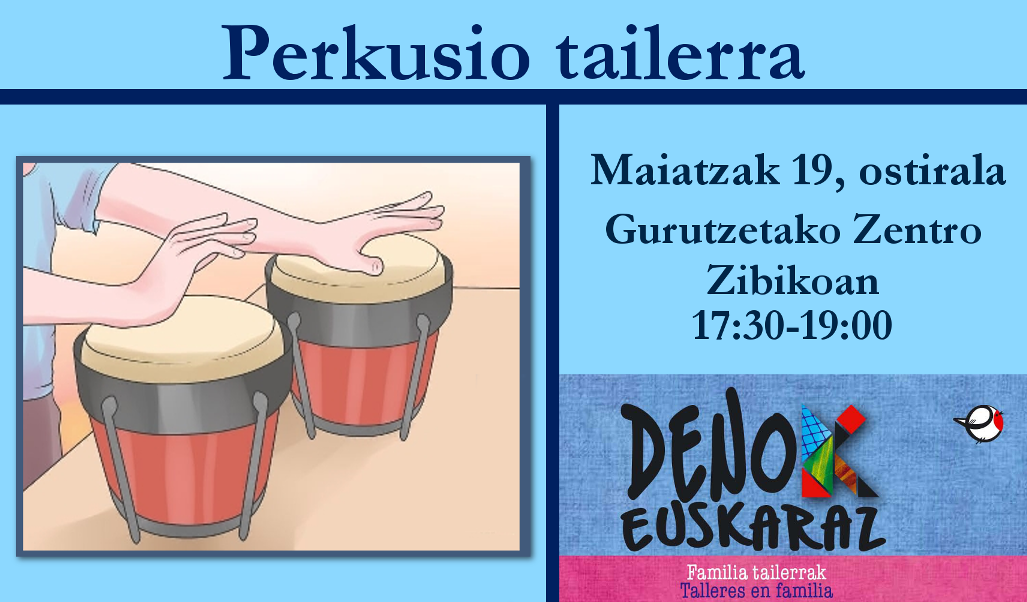 Perkusio tailerra famiilian Barakaldoko Euskara Sailaren ekimenez 2017-05-15 Denok euskaraz, familia tailerrak programaren barruan PERKUSIO TAILERRAizango dugu Barakaldon: Noiz:Maiatzak 19, ostirala Zer:Perkusio tailera Non:Gurutzetako Zentro Zibikoan Zer ordutan: 17:30-19:00 Izena emateko:euskara@barakaldo.orgedota94478 92 41. Maiatzaren 15etik 18ra arte. Iturria: euskara.barakaldo.eus Bidalketetan zehar nabigatu Previous Previous post: Dieta orekatua, ohitura desegokiak eta elikadura mitoak izeneko hitzaldia Barakaldoko Hizkuntza EskolanNext Next post: Barakaldoko Whatsapp lehiaketaren sari banaketa