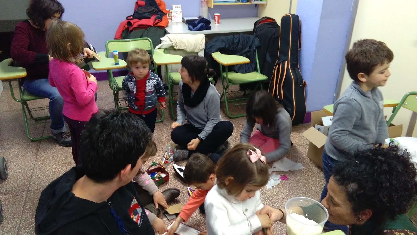 Asteazkenean, martxoak 21, 18 lagun elkartu ginen material arruntak erabiliz (plastikoa, kartoia, papera…), musi-tresnak egiteko. Umeek zein gurasoek primeran pasatu zuten, Marijok emandako tailerrari esker. Gainera, amaieran, tailerra borobiltzeko, abestu genuen, Marijo eta Ana Mari kantulagunek zuzendua.
