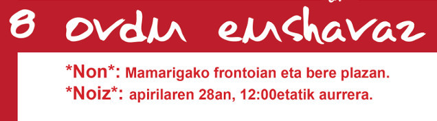 Apirilaren 28rako Ibilaldiak, Sugegorri elkartearekin batera, Mamarigako frontoian eta bere plazan, “8 orduz euskaraz” ekitaldia antolatu du. 12:00etan hasita, umeentzako tailerrak, herri-bazkaria eta dantza-plaza egongo dira. Bazkarirako txartelak (helduen menua 16 euroan eta umeena 12an) ikastolan bertan eta ondorengo tabernetan eskura ditzakezue:
