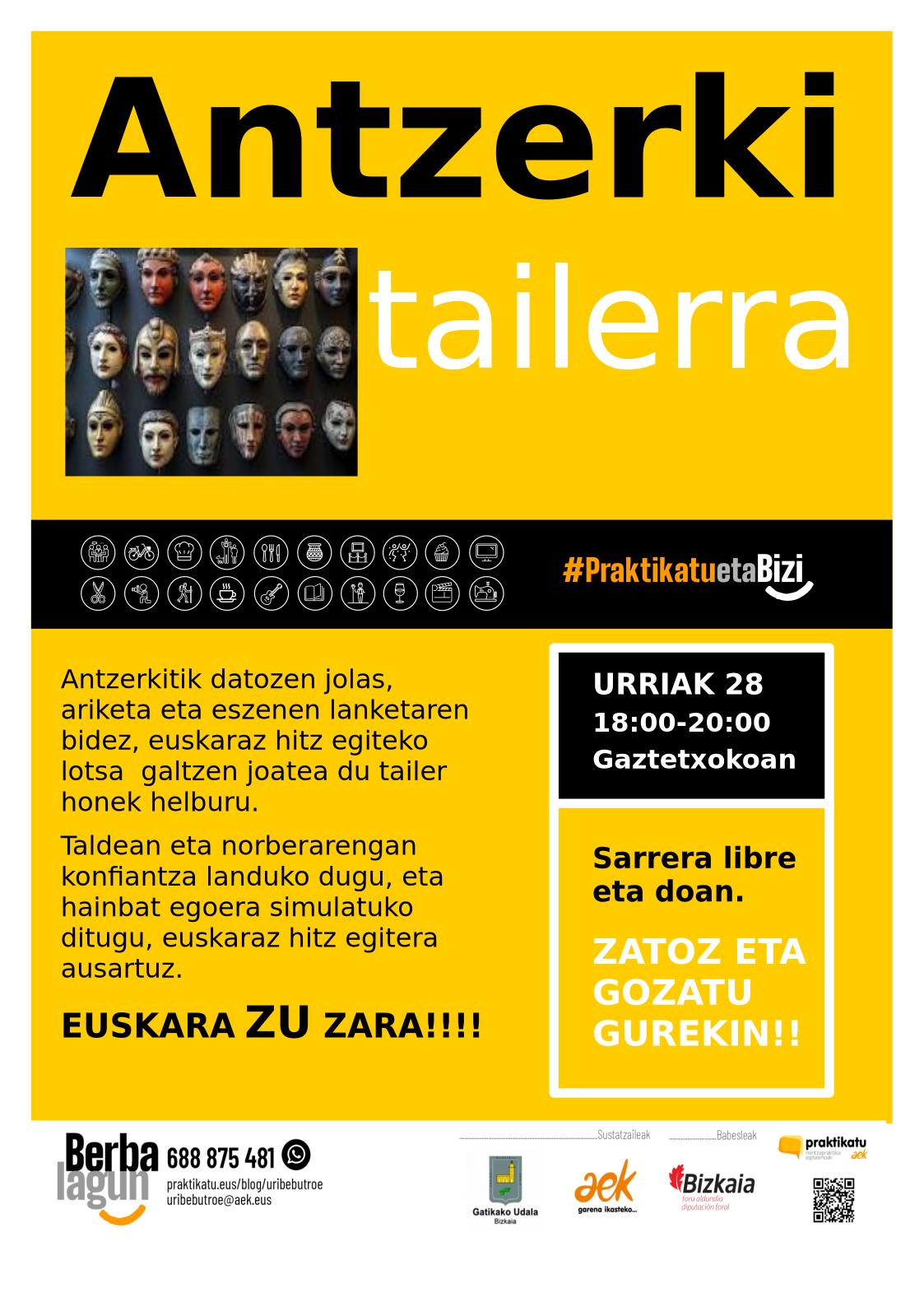 Antzerkitik datozen jolas, ariketa eta eszenen lanketaren bidez, euskaraz hitz egiteko lotsa galtzen joatea du tailer honek helburu. Taldean eta norberarengan konfiantza landuko dugu eta…