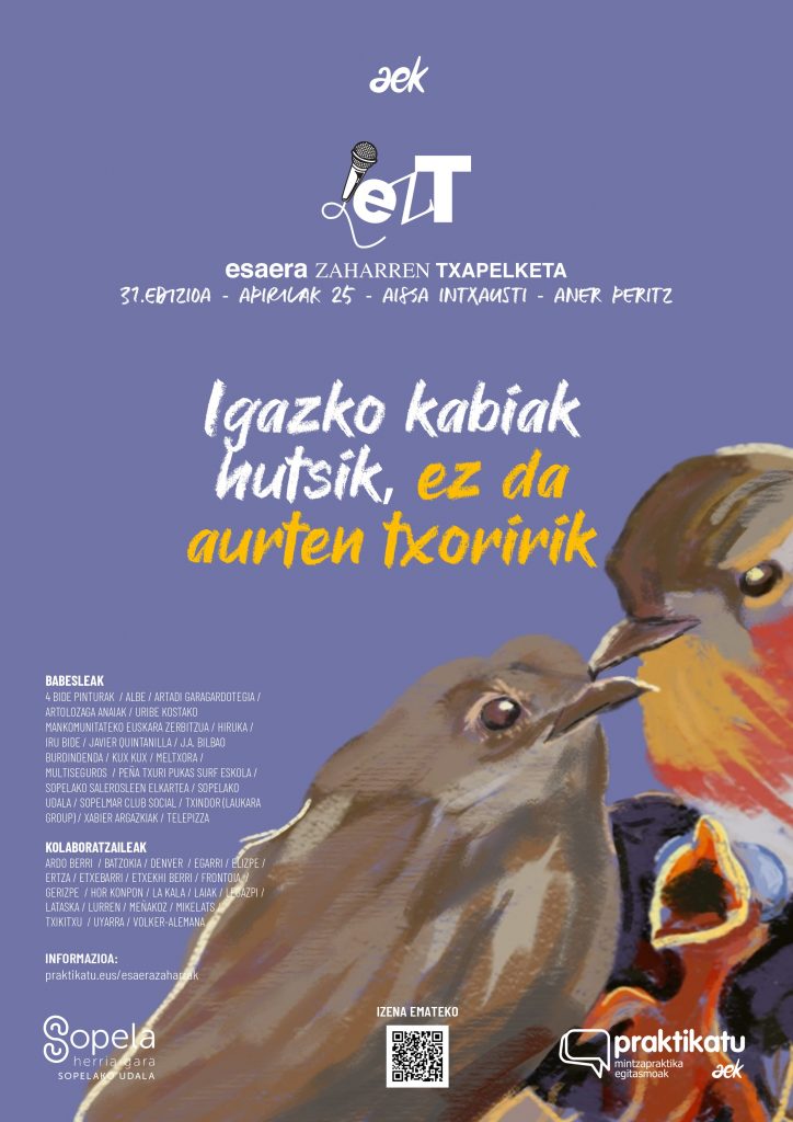 Aurten, apirilaren 25ean ospatuko dugu, Sopelan, Esaera Zaharren Txapelketa; oraingoa 31. edizioa izango da, eta “Igazko kabiak hutsik, ez da aurten txoririk” izango du leloa. Parte hartu nahi baduzue, ezin errazagoa da: bi, hiru edo lau laguneko taldea osatu, izen “dotorea” erabaki, 100 esaerako zerrenda ikasi (99 zahar eta 1 berria), eta erreserba-fitxa bete (apirilaren 20a da horretarako azken eguna).