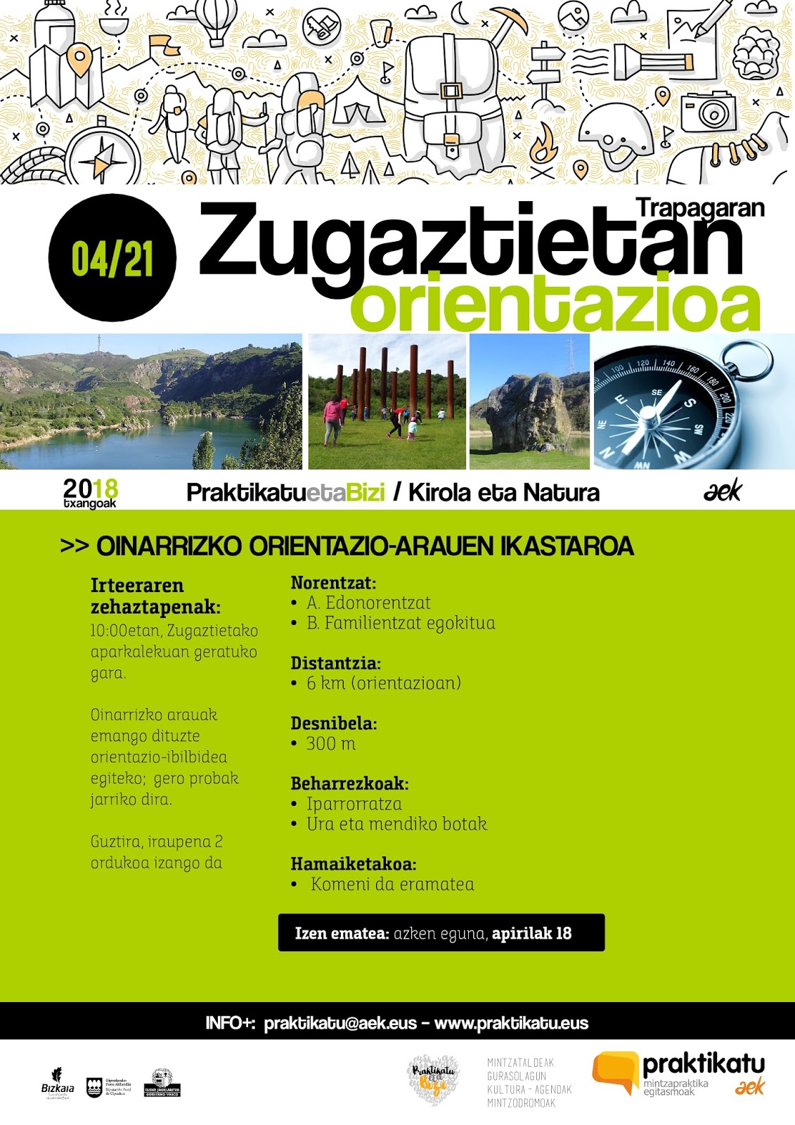 10:00etan Zugaztietako aparkalekuan geratuko gara. Oinarrizko arauak emango dituzte orientazio-ibilbidea egiteko; gero probak jarriko dira. Guztira, iraupena 2 ordukoa izango da.